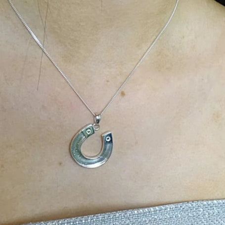 This beautiful pendant is crafted from solid 925 silver and shaped like a horse shoe, making it an ideal keepsake for horse hair. It features a 5mm wide setting area and measures 25 by 24mm overall, combining elegance with meaningful design.