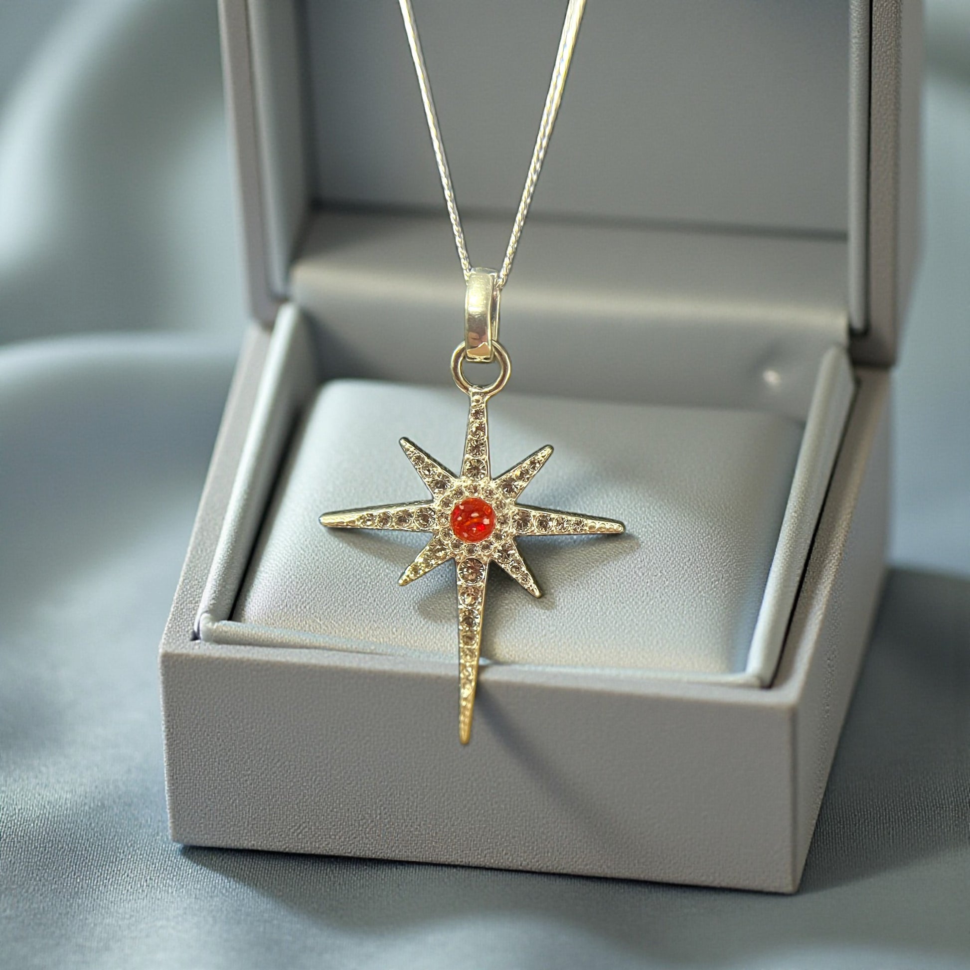This beautiful 925 silver star pendant is adorned with sparkling CZ stones, creating a dazzling look. Each pendant comes with your choice of a solid silver curb chain in lengths from 16" to 24", carefully packaged and accompanied by a certificate of authenticity for your reassurance. Crafted from high-quality silver, this pendant measures 38x30mm with a 5mm stone setting, making it a meaningful and elegant keepsake.